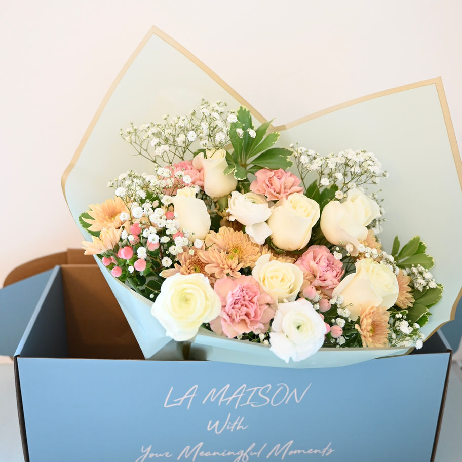 Thoughtfully crafted by our talented florists, this bouquet mixes soft peach tones with creamy whites, making it a lovely highlight for any occasion. We're dedicated to quality, ensuring each bouquet is fresh and gorgeous. Experience the top-notch service and attention to detail that only LaMaisonFlowerStudio provides. Treat yourself or someone special to The Coral Blossom today.